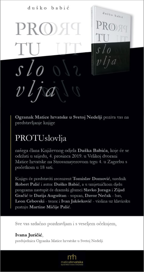 našega člana Književnog odjela Duška Babića, koje će se održati u srijedu, 4. prosinca 2019. u Velikoj dvorani Matice hrvatske na Strossmayerovom trgu 4 u Zagrebu s početkom u 18 sati.
